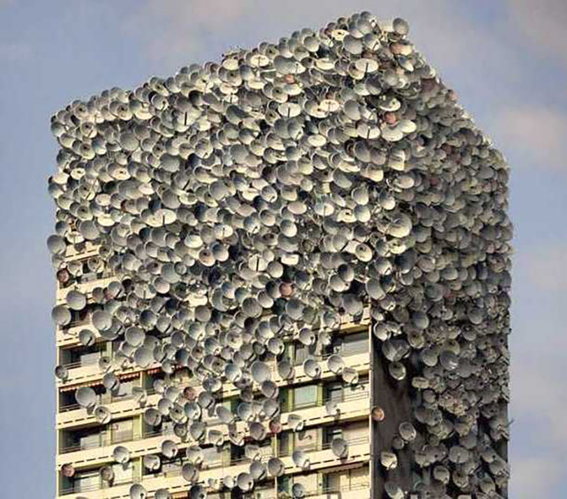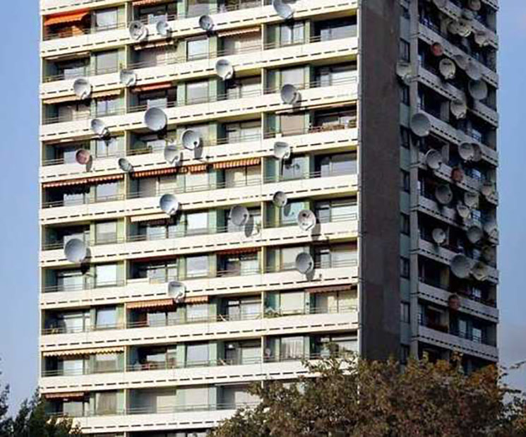 Un mois plus tard, d’autres copropriétaires ayant eu vent de cette affaire installent également leurs antennes sur les murs de l’immeuble, pourquoi pas? Et une nouvelle photo de l’immeuble révèle le chaos en train de s’instaurer: